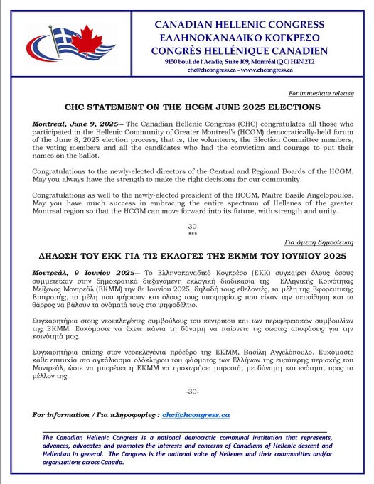 ΔΗΛΩΣΗ ΤΟΥ ΕΛΛΗΝΟΚΑΝΑΔΙΚΟΥ ΚΟΓΚΡΕΣΟΥ ΓΙΑ ΤΙΣ ΕΚΛΟΓΕΣ ΤΗΣ ΕΚΜΜ ΤΟΥ ΙΟΥΝΙΟΥ 2025 / CANADIAN HELLENIC CONGRESS STATEMENT ON THE HCGM JUNE 2025 ELECTIONS